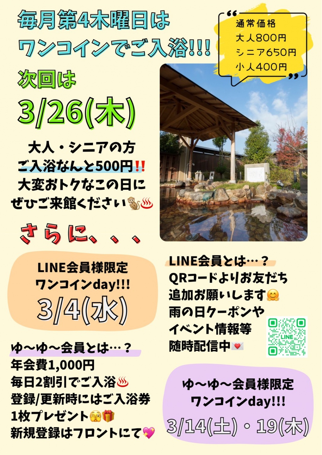 LINE会員さまは会員様に配信されるクーポン提示で入浴料金500円!